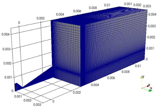 Once we defined the refinement level in the plane (0,x,y), the 3D mesh was built by extrusion along the micro-nozzle depth direction, i.e., the z-axis in Figure 3. Therefore, the 3D GIS was performed to define the proper refinement level into the micro-nozzle along depth-wise direction (z-axis in Figure 3), which ensured the best trade-off between accuracy and computational cost.