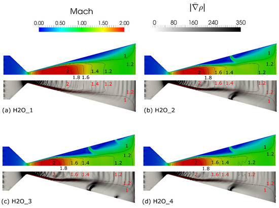 Contour plot of the Mach number and Schlieren computations: (a) test case H2O_1 (baseline); (b) test case H2O_2 (additional mass flow rate with jet 1 = ON, jet 2 = OFF); (c) test case H2O_3 (additional mass flow rate with jet 1 = ON, jet 2 = ON); (d) test case H2O_4 (bypassed mass flow rate with jet 1 = ON, jet 2 = OFF).