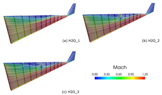 3D representation of the water vapor flow into the micro-nozzle through contour plot of the Mach number in combination with streamline visualization: (a) test case H2O_1 (baseline); (b) test case H2O_2 (additional mass flow rate with jet 1 = ON, jet 2 = OFF); (c) test case H2O_3 (additional mass flow rate with jet 1 = ON, jet 2 = ON).