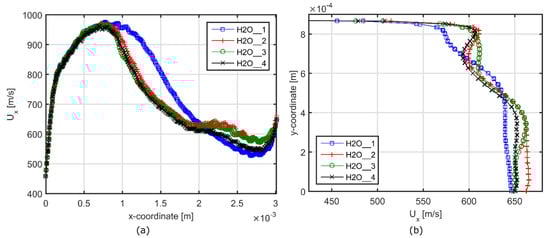 Profiles of the axial velocity Ux for the water vapor flow in the symmetry plane (0,x,y): (a) at y = 0 m (along the symmetry axis); (b) at x = 0.00301 m (along the width-wise direction). Test cases: H2O_1 (baseline); H2O_2 (additional mass flow rate with jet 1 = ON, jet 2 = OFF); H2O_3 (additional mass flow rate with jet 1 = ON, jet 2 = ON); H2O_4 (bypassed mass flow rate with jet 1 = ON, jet 2 = OFF).