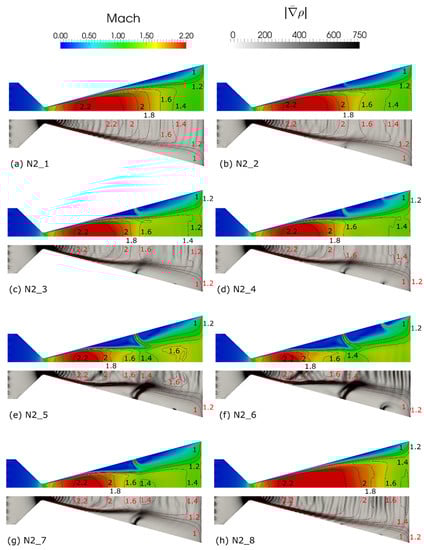 Contour plot of the Mach number and Schlieren computations: (a) test case N2_1 (baseline); (b) test case N2_2 (additional mass flow rate, jet 1 = ON, jet 2 = OFF); (c) test case N2_3 (additional mass flow rate, jet 1 = ON, jet 2 = OFF); (d) test case N2_4 (additional mass flow rate, jet 1 = ON, jet 2 = ON); (e) test case N2_5 (additional mass flow rate, jet 1 = ON, jet 2 = OFF); (f) test case N2_6 (additional mass flow rate, jet 1 = ON, jet 2 = ON); (g) test case N2_7 (bypassed mass flow rate, jet 1 = ON, jet 2 = OFF): (h) test case N2_8 (additional mass flow rate, jet 1 = OFF, jet 2 = OFF).
