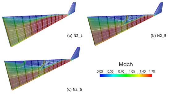 3D representation of the water vapor flow into the micro-nozzle through contour plot of the Mach number in combination with streamline visualization: (a) test case N2_1 (baseline); (b) test case N2_5 (additional mass flow rate, jet 1 = ON, jet 2 = OFF); (c) test case N2_6 (additional mass flow rate, jet 1 = ON, jet 2 = ON).