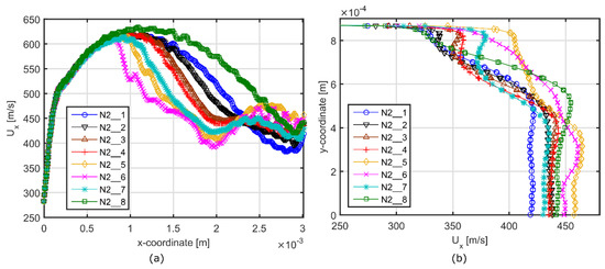 Profiles of the axial velocity Ux for the water vapor flow in the symmetry plane (0,x,y): (a) at y = 0 m (along the symmetry axis); (b) at x = 0.00301 m (along the width-wise direction). Test cases: N2_1 (baseline); N2_2 (additional mass flow rate, jet 1 = ON, jet 2 = OFF); N2_3 (additional mass flow rate, jet 1 = ON, jet 2 = OFF); N2_4 (additional mass flow rate, jet 1 = ON, jet 2 = ON); N2_5 (additional mass flow rate, jet 1 = ON, jet 2 = OFF); N2_6 (additional mass flow rate, jet 1 = ON, jet 2 = ON); N2_7 (bypassed mass flow rate, jet 1 = ON, jet 2 = OFF): N2_8 (additional mass flow rate, jet 1 = OFF, jet 2 = OFF).