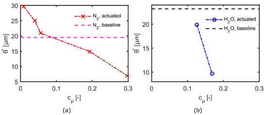 Concerning the secondary injection in water-propelled VLM mode (Figure 12b), similar beneficial impact of the micro-jet blowing active control is figured out: θxy decreases up to about −57% at the highest cμ = 0.168 (test case H2O_3), with steeper negative slope than the momentum thickness reduction curve retrieved for the nitrogen gaseous secondary injection (red dash-dotted line in Figure 12a).