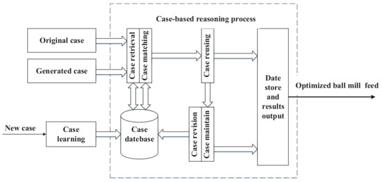 Because of these difficulties, the research on the grinding process has received much attention. Generally, the PPS needs to be controlled within the desired range suitable for the subsequent beneficiation process. With the development of new intelligent modeling and control methods, many intelligent modeling methods have been successfully implemented in the modeling process of grinding processing. Recently, the advanced control methods based on model predictive control [2,3,4] or supervisory control [5,6] for the grinding process have been discussed. It is worth noting that the results mentioned above are stringently based on the mathematical models of the system. However, the grinding process is difficult to describe by mathematical models since the actual industrial process is essentially a multi-input–multi-output system (MIMO) with large inertia, nonlinearity, strong coupling, uncertainty, and interference factors [7]. Moreover, due to the lack of online analyzers measuring the grinding particle size and the difficulty of obtaining transfer functions of the grinding process, many concentrators cannot realize optimal control by adopting the model-based control method proved to be effective in other plants [8]. The distinct element method, finite element method, smooth particle hydrodynamics method and discrete element coupling algorithm were adapted to the grinding process, focusing on the media motion state, mechanism research, mill parameter optimization research, ball mill power consumption and energy distribution [9,10]. The coupling of various methods can realize the combination of advantages of various methods and simulate the actual working conditions of the ball mill more truly and comprehensively [11,12,13]. However, due to the complex and unstable model, the uncertainty of ore properties, high technical experience requirement and high computational cost, the progress of the coupling method in the mill simulation is difficult to implement. With the development of science and technology, a hybrid intelligent optimal control method based on an expert system for the operation of the complex industrial process is proposed. CBR [14,15], rule-based reasoning (RBR) [16,17] and a fuzzy expert system [18,19,20] are applied to provide potential solutions for such grinding problems. Among these methods, CBR is an approach to problem solving that utilizes previous cases and experiences that are similar to the current one. The advantage of this method is that it bypasses the unavailable parameters and makes full use of the available experience and data to obtain satisfactory results with little change in the process equipment. Compared with other intelligent algorithm, another important advantage of CBR is that it enables sustained learning by updating the case base after a problem has been solved.