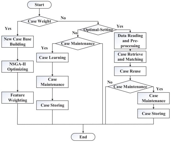 - If , save the new case in the case base and delete the oldest case (all generated cases are oldest cases; relatively similar ones are deleted first). The purpose is to update the case base to accommodate the effects of changes in processes, the environment, etc.