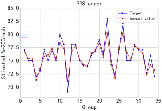 Figure 11 shows the target and the actual value of the overflow particle size. The mean absolute error (MAE) of the target and the actual value is 1.1289. This error is within the allowable range. What is more, the curve of the actual value and the target value are basically consistent. The algorithm can quickly and accurately calculate the set value of the ore and water feeding, according to the ore characteristics and the target of the overflow particle size compared with the traditional manual method. However, when the target value is less than 72 or greater than 80, the error is large. This is due to the following factors: (1) The cases in the case base are not enough, especially beyond 72–80. The cases cannot contain all the characteristics of the ore. (2) The target value beyond 72–80 means that the ore is much better or worse than the normal state. The other operating parameters of the grinding process are not adjusted according to the ore properties. In industrial applications, some error, such as human error and equipment error, makes the algorithm have some deviation, and some special cases also affect the accuracy of the system. As the optimization system is used for a long time, a large number of cases covering various situations are stored in the case base and the algorithm will be more accurate.
