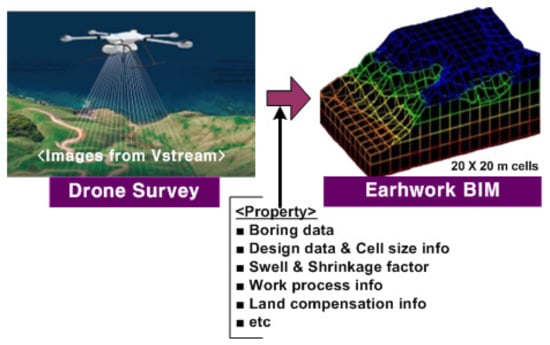 For smart earthwork, a 3D scanner or a drone is used to scan a field’s topography, and a triangular network is formed using raw scan data to complete a surface model (Figure 1). In order to establish an earthwork plan, the entire area is divided into cells 20 × 20 m in size, and location information for each cell, boring data, conversion factor of soil, design information, work allocation information, work progress information, and land compensation information are used to create a BIM model.