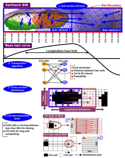 Earthwork is a basic process in most construction works, and it has a great influence on productivity and construction cost. To date, various forms of research and development have been conducted to increase the efficiency of earthwork. Earthwork can be divided into 2D-based earthwork (such as land development) and linear earthwork (such as road work and railroad work). In the 2D-based earthwork, a two-dimensional configured target area is divided into cells of a certain size, divided into cut cells and fill cells, and various optimization techniques are applied to minimize the distance for soil distribution. In the case of linear earthwork, the mass-haul diagram method and the traditional linear model are mainly used to establish an optimized distribution plan for cut cells and fill cells. There are several methodologies applied in the establishment of the soil distribution plans [23,24,25,26,27,28]. Past earthwork-related studies established a plan for the entire earthwork site, and later studies suggested a methodology for establishing a plan that excluded the deterrent and various obstacle areas. However, the difficulty of applying the proposed methodologies to the sites in Korea is that there is a lot of variability in the process of defining soil allocation. For example, an exclusion zone could randomly occur due to unaccepted land expropriation, which could affect the movement path of a truck within the site. Previously, the soil distribution plan was used only for the purpose of establishing the process plan and calculating construction costs. However, from the perspective of applying the system to smart construction, the volume distribution plan should be linked as an input for construction equipment, and it should be used as essential information to maximize efficiency of the work site. In this respect, the soil distribution plan should reflect the actual site situation while guaranteeing a minimum travel distance for the vehicle.