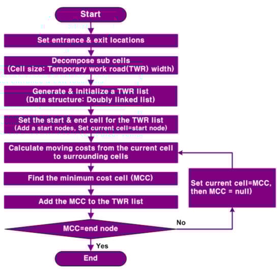 At the beginning of the construction stage, if the location of the entrance/exit route is determined, a temporary road must be created for the construction equipment to move. The movement from the cut cell to the fill cell of the task package formed by the soil distribution plan should not be a straight line between the two cells. Since the moving path of construction equipment is determined according to the location of the temporary road, the optimal location of the temporary road has a great influence on construction productivity. Figure 4 shows the process of creating a temporary road, and it provides information regarding the detailed cells of a temporary road, reaching from the start point to the end point using a double linked list data structure.