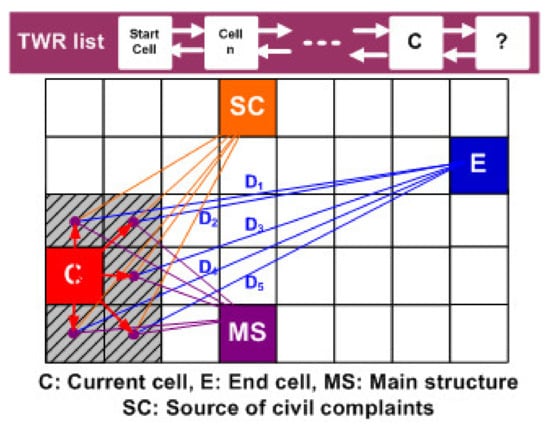 As shown in Figure 5, if a cell becomes part of a temporary road after the current cell is selected when constructing a temporary work road list, five cells around the current cell become candidate groups, among which the cell requiring the least cost is selected. The following are the elements that make up the cost model.