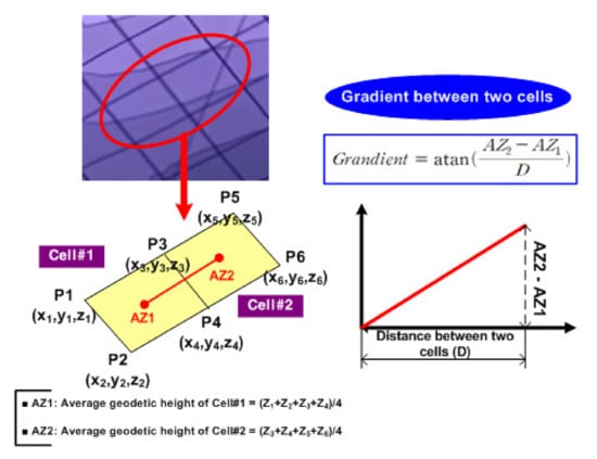Gradient refers to the ground slope between the current cell and the cells located around it. Theoretically, it should be less than 20 degrees, which is the standard at which construction equipment can operate. In practice, it should not exceed 10 degrees, unless it is unavoidable. If possible, an area with a gentle slope should be preferred. As for the slope between the two cells, after calculating the average elevation of each cell, the slope is calculated using the two elevations. This is shown in Figure 7.