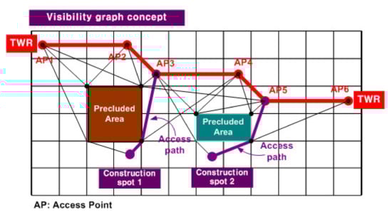 When a truck enters a construction site through an access road, it moves along the temporary road installed. Most of the truck’s movement paths are the same as the location of the temporary road, and some movement paths are set in areas other than the temporary road, depending on the situation of the construction process. Figure 8 shows a visibility graph indicating the route for entering the construction location from each AP (access point) of the temporary road that can be generated by avoiding the removal area through which construction equipment cannot pass. In the concept of the Euclid shortest path, the shortest path is simply selected but, in this study, the entry path is also determined by considering the trafficability of construction equipment. Considering the drivability of construction equipment, moving to the temporary road as quickly possible and entering the construction area with the shortest route from the temporary road becomes an efficient access route. In order to enter construction zone 1, it is necessary to enter through the path through AP3; to enter construction zone 2, it is efficient to enter through the path through AP5.