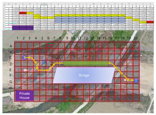 As shown in Figure 9, the bridge (from Cell: E8 to Cell: G16) is under construction, so it is impossible for trucks to pass over it from the access road (S, Cell: C2) or the exit (T, Cell: G20). In the case of moving in the direction of the bridge, the position of the hypothetical road was determined. A moving cost model reflecting an expert’s heuristic was used to search for a path from the entrance road to the exit, and the results are displayed in yellow lines. From Cell D9 to Cell D15, the construction company has opened and is currently using a temporary road (green), which is consistent with the results presented in this case study; the inconsistent areas are land that can be used when opening a temporary road at the construction site. It was found that there was a difference between using a part that was not compensated for and using a part of the existing agricultural road.