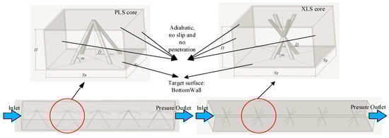 The schematic of cooling arrangement in a turbine blade is shown in Figure 1. In regions “1” and “2” are set some traditional internal cooling structures that could improve cooling efficiency and protect the blade from high temperature; however, these structures scarcely concern both heat transfer and mechanical performances. Herein, considering better performances of heat transfer and mechanics, LS was set at thin walls of the blade. Some new internal cooling channels would be established at the thin walls of the blade and LS was placed upon these channels as a component of cooling structure. PLS and XLS used herein are shown in Figure 2. Boundary conditions of LS were given as follows:
