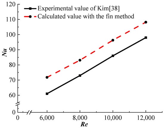 It can be observed from Figure 3 that with the increase of Re, the trend for the growth of Nu was consistent between the experiment value of Kim [38] and the calculated value of PLS channel with the fin method. Meanwhile, the maximum error between the calculated value with the fin method and the experiment value of Kim [38] was approximately 17%. Therefore, the given function of Nu was reliable.