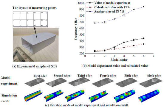 Figure 4b shows that in freq1–3, the experimental value and calculated value showed good consistency, of which the maximum error was within 10.5%. However, when it came to freq4–6, the error between them was relatively large, and the maximum error reached 24.9%. The reason for the analysis error lay in two aspects. On the one hand, due to the limitation of printing accuracy of the printer, the printed sample had certain defects. Particularly, the printing mode was adopted without internal support at the top of the channel, which made the resin material on the top of the sample not fit tightly enough. On the other hand, because the sample was a thin-walled structure, it was inevitable that some deformation would occur in the sample fixing with the vice. However, in the simulation process using FEA, there were no defects in the three-dimensional model, and its deformation was not considered when the constraints were applied. Meanwhile, the maximum errors between the modal experimental values and the simulated values caused by some defects of the test piece were 17.7% and 15.21%, respectively [40,41]. Therefore, it can be considered that the error between the experimental value and the simulation value will not greatly affect the subsequent simulation results. Additionally, Figure 4b shows that the freq1–6 of IN 718 was basically linear with that of the resin material. Therefore, the experimental results can provide guidance for research of LS channels made by IN 718.
