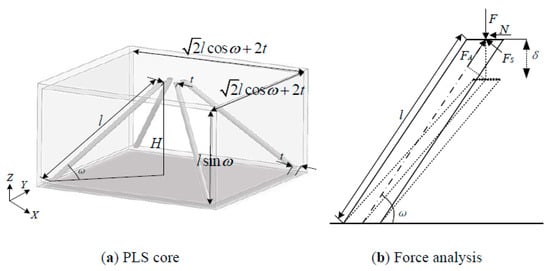 where l is the length of the member, as shown in Figure 5, l = H/sin ω. A is the area of bottom surface of the PLS core, ; D is the diameter of the member; t is a small spacing between two members at the top wall of the PLS core and also is a small spacing between one of the side walls of the PLS core and the member at the bottom wall of the core.