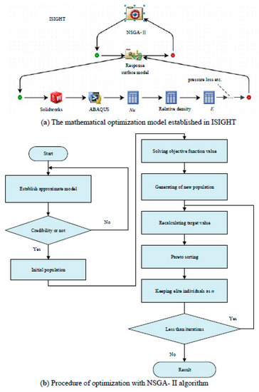 Mathematical optimization model establishment and the procedure of optimization: (a) The mathematical optimization model established in ISIGHT; and (b) procedure of optimization with NSGA- II algorithm.