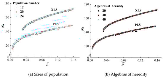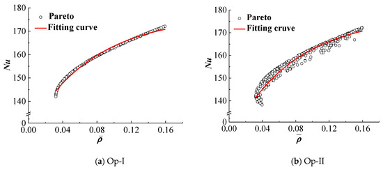 Figure 10a,b show that the distribution form of the Pareto set of solutions for Nu and in the two optimization problems presented strong convexity. Therefore, the first-order exponential function was used to fit them. The function equation is shown in Equation (33), and the values of each coefficient in the formula are shown in Table 7.
