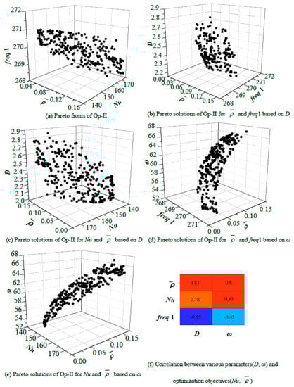 Overall and single sensitivity analysis for Op-II of XLS: (a) Pareto fronts of Op-II; (b) Pareto solutions of Op-II for and freq1 based on D; (c) Pareto solutions of Op-II for Nu and based on D; (d) Pareto solutions of Op-II for and freq1 based on ω; (e) Pareto solutions of Op-II for Nu and based on ω; and (f) correlation between various parameters (D, ω) and optimization objectives (Nu, ).