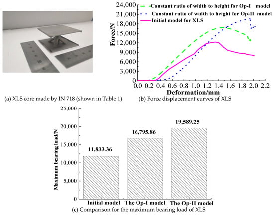 Firstly, both the initial model and the optimal model were built. Because XLS has the property of periodicity, only a single XLS core was made, as shown in Figure 11a, and two side walls of LS core were removed. Secondly, according to the GB/T 1041-2008 test standard, the unidirectional compression test of the structure was carried out by a ctm2000 universal material testing machine. The pre-cyclic loading method was adopted in the experiment, and the loading rate was 0.5 mm/min. The force displacement curve of the XLS core was obtained (Figure 11b). It can be found that the black curve was the force displacement curve of the initial model of the XLS core, and the maximum force was 8543.267 N, which was converted into the elastic modulus of 680.196 MPa. The theoretical calculation value of equivalent elastic modulus was 830.265 MPa. The error between the maximum valve of the XLS core and the theoretical calculation value was 10.3%. Therefore, E can accurately evaluate the bearing load capacity of the XLS core. Moreover, it can be observed from Figure 11b that the maximum bearing capacities of the optimization result of Op-I and Op-II were 11,089.41 N and 12,404.22 N, respectively. Compared with the initial model, the maximum bearing load capacity of the optimized structure was significantly improved. From the results of Figure 10c, the maximum bearing load capacity for the optimal structure of Op-I was increased by 29.8% compared to that of the initial model. The maximum capacity of bearing load for the optimal structure of Op-II was increased by 45.2% compared to that of the initial model. Therefore, the mathematical optimization model was accurate for bearing load performance.