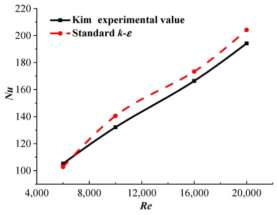 In order to verify the reliability of the model, the experimental data of XLS from Kim et al. [38] was selected. The Nu values under different turbulent models are shown in Figure 12. It can be seen that the values of the standard k-ε turbulent model were very consistent with the experimental values, with an error of 9.6%. Therefore, the standard k-ε was used in the subsequent numerical simulation.