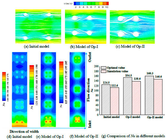 Streamline of the target surface, Nu distribution of the target surface, and Nu comparison: (a) Initial model; (b) model of Op-I; (c) model of Op-II; (d) initial model; (e) model of Op-I; (f) model of Op-II; and (g) comparison of Nu in different models.