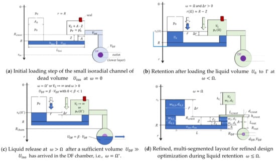 Figure 1 illustrates the basic operating principle of a CP-DF siphon valving structure located at a radial position with respect to the axis of rotation at . In a (hypothetical) priming procedure, a liquid volume is first loaded to completely fill the tiny isoradial channel; as a result, a gas volume composed of a main compression chamber of volume , an inbound segment of volume , and tiny outlet features with negligible volume contributions is cut off from the inlet that is open to atmosphere at (Figure 1a, typical dimensions in the Appendix A). The actual pressure in the enclosed gas might deviate from the ambient pressure , e.g., due to filling dynamics. Then, the remainder of is added to the open inlet reservoir. At the retention rate , the outer meniscus has progressed in the radially inbound section of cross section and axial length to the crest point at (Figure 1b).