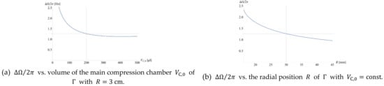 For the (deliberately) simplified geometry in Figure 1, the volume integral over across imposing the continuity of liquid volume hence reduces to the sum of the products of the (constant) cross section times the filling level of each cuboidal segment. With fully determined through , and via and , and via and , in Figure 2 can thus be directly expressed as a function of the main compression volume (a) and the radial position (b).