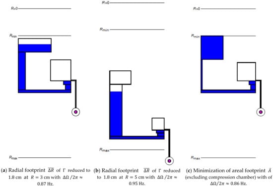 which relates the total surface area claimed by , possibly excluding the rather flexibly placeable compression chamber, to the structurable annular region spanning between and . Figure 6c presents a structure for which (13) is computationally minimized for , while, at the same time, a low band width (7) is maintained. As the manufacturing tolerances only account for a small fraction of the absolute dimensions of , they do not substantially alter the absolute and relative spatial footprints and (13), respectively. To reflect that central space is most precious, a combination of the metrics (11), (12) and (13) may be employed for design optimization of .