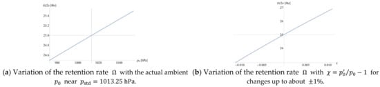 In the context of its definition, it was already reckoned that the rotationally induced pressure head (1) only accounts for a smaller portion of the actual ambient pressure . Therefore, the retention rate (6) of centrifugo-pneumatic valves reacts rather sensitively to (typically slow) changes in the atmospheric pressure , e.g., caused by local altitude or weather. Figure 8a displays the shift of the associated retention rate over a range of typical, weather-related variations in of less than 4%. Even larger deviations are impacted by the local altitude at roughly 10% per . It therefore makes sense to link a pressure sensor to a LoaD instrument in order to systematically adjust the spin protocol to the local ambient pressure , which tends to stay fairly constant over the course of an assay protocol, typically minutes to one hour.