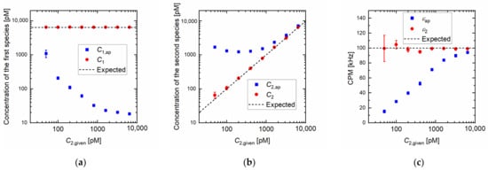 Figure 2 shows the dependency of the estimated parameters on the CPM of the second species  in the Monte Carlo simulation. The given  and  were fixed at 6400 and 1600 pM, respectively. The given CPM of the first species  was fixed at 5 kHz. The error of  became larger with the increase in the given , and the error of  became smaller, as shown in Figure 2a,b. The apparent CPM  was always underestimated, as shown in Figure 2c.