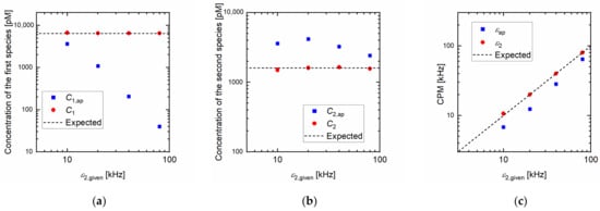 Figure 1 shows the dependency of the estimated parameters on the concentration of the second species in the Monte Carlo simulation. The CPMs of the first and second species were 5 and 100 kHz, respectively. We assumed that the CPM and the diffusion time of the first species were determined by measuring the pure solution of the first species, and we can correctly separate the fractions of the first and second species in the obtained ACF. The number and CPM of the second species were unknown. The concentration of the first species was 6400 pM, and the second species was the dilution series in the generation of the fluorescence signal by simulation described in Appendix B. Figure 1a shows a comparison of the estimated concentration of the first species  and the given concentration of the second species . The apparent concentration , which was obtained using Equation (A11), of the first species decreased with an increase in the  despite the concentration of the first species being independent of the concentration of the second species. Note that the apparent concentration obtained by Equation (A11) is not correct value and should not be used in the case of the samples containing multiple brightness species because the apparent value is theoretically incorrect and the discrepancy between the apparent values and the expected value can be large as shown in the Figure 1. Conversely, the concentration of the first species obtained by Equations (A14) and (A21)  was independent of the , and the values agreed well with the expected value. Figure 2a shows a comparison between the estimated  and the given . The error of the apparent concentration of the second species  was large, especially at low concentrations of brighter species; however, the concentration obtained by our calculation  was in good agreement with the expected concentration. Figure 1c shows the results of the CPM. The apparent CPM is given by Equation (A12) in Appendix A. The apparent CPM increased with the increase in the number of brighter species and approached the given CPM of the second species. In contrast, the corrected CPM was in good agreement with the given CPM of the second species.