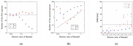 Finally, we applied the correction method to the experimental results. Figure 3 shows the results of FCS measurement on the mixture of two fluorescent beads: Beads1 with a diameter of 30 nm and Beads2 with a diameter of 51 nm. The CPM of Beads1 and Beads2 were measured as  and  kHz, respectively, in pure solutions. The number of Beads1 was fixed at 57.9 (final concentration), and the dilution series of Beads2 was mixed into the Beads1 solution. In the fitting analysis of the obtained ACFs, the model Equation (A9) was used for two species. The diffusion time of the first species was fixed to the value measured in pure solutions to improve the accuracy of the fitting because we assumed that the first species was known. The measurements were performed four times on the same samples, but at different positions in the solution (). The numbers of the first species  obtained by Equation (A14) agreed well with the expected values, as shown in Figure 3a. The numbers of the second species  obtained by Equation (A17), also agreed with the expected values in the range of dilution ratio of Beads2 was higher than 0.1 as shown in Figure 3b. In the range of dilution ratio of Beads2 lower than 0.1, the error of  was large. This was likely caused by too low concentration of the Beads2. Figure 3c shows the apparent CPM  and the corrected CPM2 . In the high concentration range of Beads2, some data points took the values around the expected value. There were also the data points with  higher than the expected value. This was likely indicating that there was some small aggregation of fluorescent beads. The data points of  were decreased from n=8 because the corrected  was 0 at some data points, and we could not calculate  because of division by zero in that case.