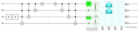 Two qubits in superposition and the second with a relative phase of 180° (image obtained using the https://algassert.com tool, accessed on 23 June 2021).