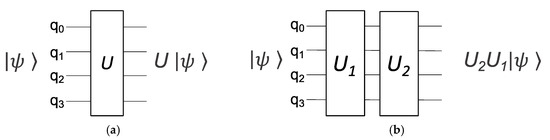 Modules are considered, under the circuit representation, as “regular” gates that take qubit lines as inputs, apply the operations included inside the module to the joint state represented by the input qubits, and have the same number of qubits lines as output. Each operation (gate) corresponds to applying a concrete matrix to the quantum state, so the gates that make the module up are written from left to right. Figure 4 shows a simple quantum module with four (input and output) qubits (a), and a program composed by two sequential modules (b).