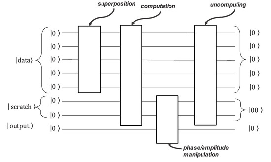 Figure 6 shows a possible abstract structure of a general module. Some scratch (ancilla) qubits could be considered (as auxiliary) in order to make the computation reversible. The result of the computation could be stored in the relative phase of the output qubit/s (or directly as magnitude). The scheme showed corresponds to a module which itself includes the reverse of the operation performed. As long as the computation does not interfere with the relative phases of the output registers, the information can survive the uncompute step [30]. Please note that not all parts of the figure are mandatory. For instance, a module may not need scratch qubits or to perform the uncompute step.