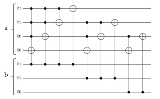 Example of reusable module for adding two numbers represented by the register a and b. Despite it does not include all the elements indicated above, it is a module that fulfils the constraints required to be a module (image obtained using the https://algassert.com tool, accessed on 23 June 2021).