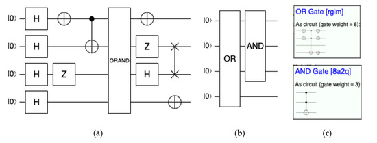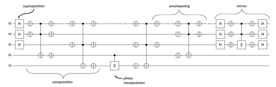 - Barenco, A.; Bennett, C.; Cleve, R.; DiVincenzo, D.; Margolus, N.; Shor, P.; Sleator, T.; Smolin, J.; Weinfurter, H. Elementary gates for quantum computation. Phys. Rev. A 1995, 52, 3457–3467. [Google Scholar] [CrossRef] [PubMed] [Green Version]