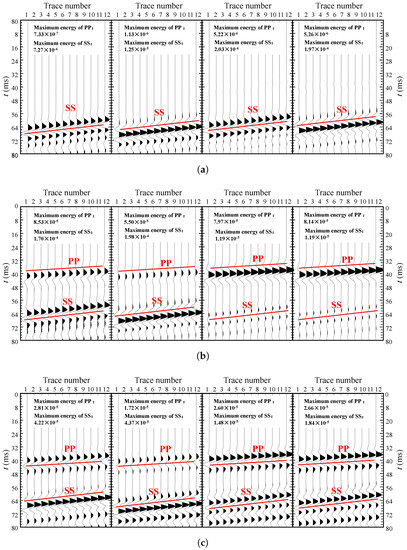 Figure 6a shows the three-component seismic profile when the karst cave is filled with soft soil. Similar to the model with a vertical single interface, the energy of the S-wave is still stronger than that of the P-wave. In the seismic profile of the component, the energy of is relatively weak and almost unrecognizable, whereas in the seismic profile of the component, only the reflected S-wave can still be observed. The energy of the reflected P-wave is the strongest in the seismic profile of the component, and the energy of the reflected S-wave is the strongest in the seismic profile of the component. Comparing the energy of the two kinds of reflected waves, it can be found that the energy of the second reflected waves is stronger than that of the first. This is mainly because the first interface of the cave has a “divergence” effect for the seismic wave. This interface and the inside of the cavernous cavity play the role of “gathering” seismic waves.