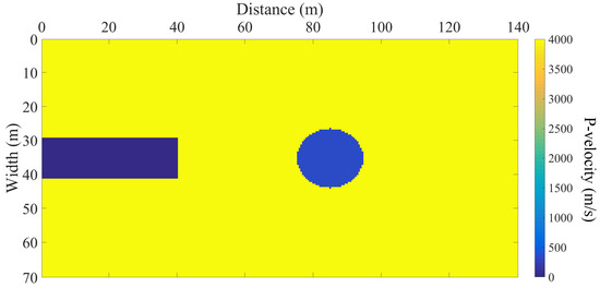 As shown in Figure 1, we set up a model with a single vertical geological interface and its radius and width are 35 m and 120 m, respectively. The tunnel is 40 m long and has a radius of 6 m. The center of the interface is 45 m away from the tunnel face in the z-direction. The P-velocity and S-velocity of the surrounding rock are m/s and m/s, respectively; those of the medium behind the interface are m/s and m/s; the grid spacing is m. The time sampling interval is ms, and the total time window is s.