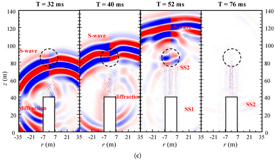 Figure 6c is the seismic profile of a karst cave filled with air. Because the S-wave velocity in the air is the same as that in the water, the energy intensity and first arrival time of the S-wave reflection are the same as that in Figure 6b. The main differences lie in the reflection of P-waves: the P-velocity in the air (acoustic wave) is much lower than that in other media. Therefore, it can be approximated that P-waves cannot pass through the cavity to form . This is why only the in-phase axis of can be observed in Figure 6c. As for the energy of P-wave reflection, from a numerical point of view, although the maximum energy of the P-wave is reduced, it is the energy of , which is close to that of enhanced by the focusing effect of karst cavity filled with soft soil. It can be determined that the energy of the reflected wave produced by the cavity is the strongest, which also explains the strong interference of the tunnel body to the seismic wavefield. Since the caves and tunnels are strong reflectors at this time, the energy of reflected waves is enhanced, and the energy of multiple waves is also greatly enhanced. Therefore, the multiple waves generated by P/S-waves can be observed in the seismic profile of Figure 6c.