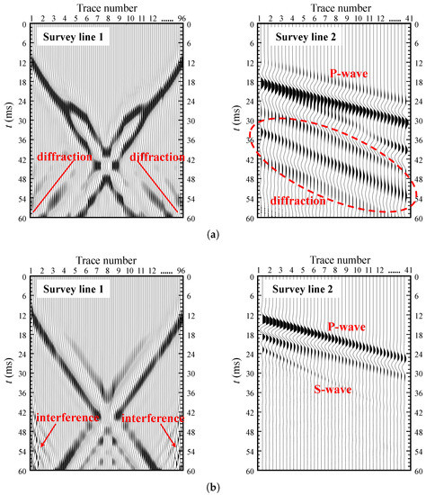 Further comparing the seismic profiles of survey line 1 and survey line 2, as shown in Figure 11, it can also be seen that the forward simulation method in cylindrical coordinates is significantly better than that in the Cartesian coordinate system in suppressing the interference of diffracted waves at the mutation point. Because survey line 1 is arranged around the tunnel, the seismic profileing event axis presents a typical “X” shape. The intersection of the event axis corresponds to the receiver at the bottom of the tunnel. Therefore, the dispersion caused by the interference of seismic waves is only generated in the lower half of the “X” shape. The frequency is higher than the direct wave, and the energy is weaker than the direct wave, and weakens as the seismic wave propagates toward the front of the tunnel. The diffracted wave interference caused by the mutation point is different. It can be seen from Figure 11a,b that the wavelength of the diffracted wave interference is close to the direct wave, and will propagate toward the front of the tunnel. When the direct wave energy weakens with its propagation distance increases, the diffracted waves even conceal the in-phase axis of the shear wave.