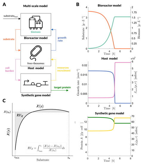 In order to take into account the different scales involved in the model of a bioprocess, we consider a multi-scale model integrating the different occurring phenomena. From top to bottom (Figure 1A), our model describes the interactions in the three levels considered: the biomass and substrate dynamics in the bioreactor, the dynamics of the host and those of the synthetic gene circuit expressing the proteins of interest.