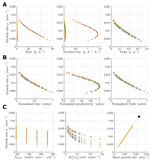 Therefore, there exists a trade-off between the titer and yield indexes versus the productivity index since they require different conditions to minimize their values that are incompatible with each other. Figure 3B shows that none of the combinations of the colored dots is able to make all three indices zero at the same time (this also true for the gray dots, although it is not shown in the graph).