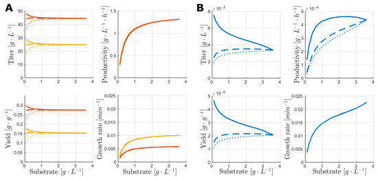 To take a deeper look into the relative variation index and their meaning, it is necessary to analyze the variation of indices for changing levels of substrate. Figure 4 shows that a change in the substrate can affect the TRY values by causing them to go down or up with respect to the TRY nominal value (it may even be the case that the TRY has one section where TRY goes up and another where TRY goes down). For example, Figure 4B shows that in the case of titer it is possible to select a value of (solid blue line) that allows us to increase the titer when the substrate decreases, and we can also select a different value of (dotted blue line) that decreases the titer when the substrate decreases.