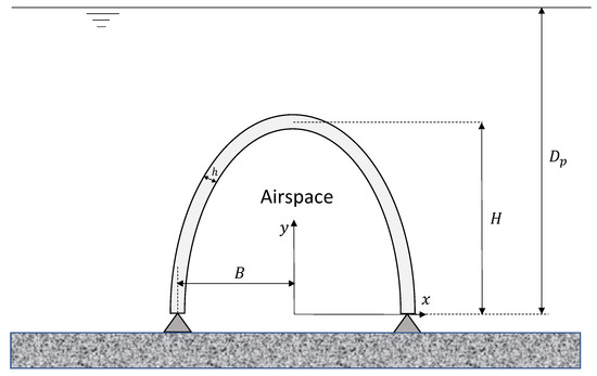 The funicular arch shape can be represented in Cartesian coordinates, simplifying the traditional geometric expressions based on the arch length and the angle of the tangent [30]. From these analytical expressions, the maximum span and height of the funicular submerged arch, as well as the minimum compression force (and therefore, the minimum amount of airspace), can be determined. The hydrostatic pressure and self-weight load were considered in [31] to show the influence of the self-weight in the funicular shape, resulting in a sufficiently accurate solution for practical applications.