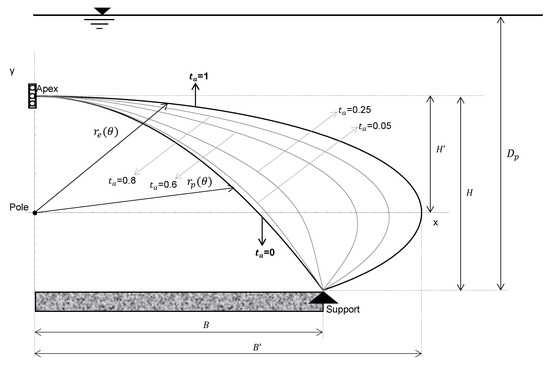 where and is the radial coordinate of the intermediate curve corresponding to the parameter and the angular coordinate . Equation (5) represents a parametric family of curves between parabolic and elliptical forms, where the shape parameterization is posed as a function of four parameters: , , B and . However, only three of them are independent, as the arch support is assumed to be contained in the ellipse defined in Equation (4), and in this case, and must verify