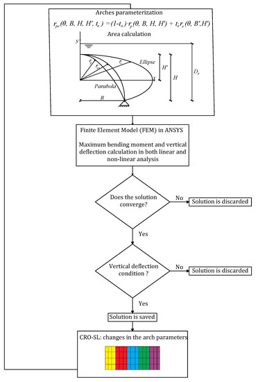 The calculation process is represented in Figure 3. It starts with random parameter values, which are contained in a specific range. These arch parameters are used to calculate the area under the arch (), the maximum absolute bending moment (), and the maximum vertical deflection (). The parameters and are calculated using ANSYS software. The arch parameters are changed by the CRO-SL in the next interactions in order to minimize the functional defined into Equation (10). Thus, the numerical model is updated with the new proposed geometrical parameters. In addition, a penalty value is applied to the functional value when this iterative strategy does not converge or . Thus, the quality of each arch is evaluated through the functional value, so the CRO-SL evolves the population towards high quality solutions, i.e., arches which minimize the objective functional value, given by Equation (10). The CRO-SL algorithm and its substrates (search procedures) will be fully described in the next section.